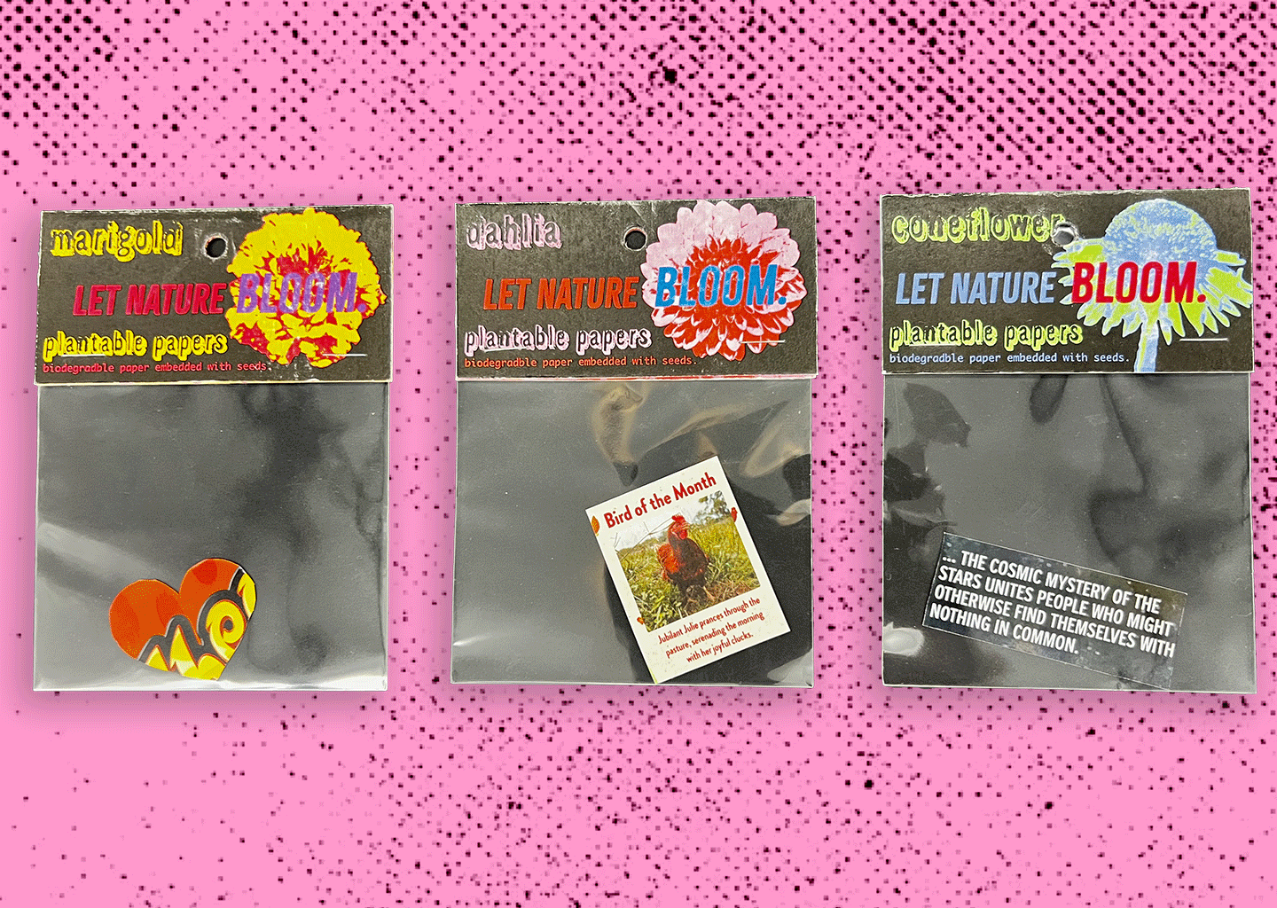 This project was about creating a set of three pouch headers for clear bags that would be filled with plantable paper that grows wildflowers. Each header (a dahlia, coneflower, and marigold) features a different bright color palette set against a black background. The goal was to keep the design bold, simple, and easy to recognize while highlighting the type of flower in each pack.